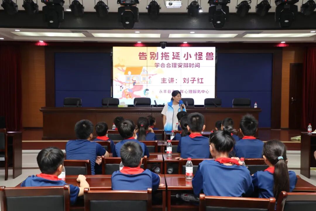 “请大家跟我一起站起来,扮演一个小闹钟吧。”一个生动有趣的小游戏拉开了心理大讲堂的帷幕。永丰县青少年心理服务中心的刘子红老师以“告别拖延小怪兽,学会合理安排时间”为主题,让大家认识拖延的危害及告别拖延的办法。孩子们纷纷表示在今后的学习生活中会告别拖延症,做好学习规划,努力成为对社会有用的人。