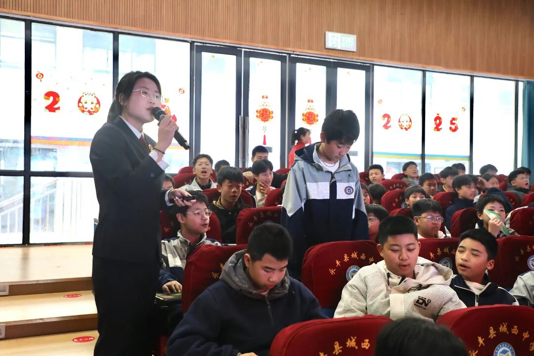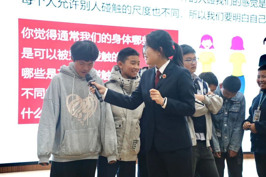 课堂创新形式精彩纷呈,趣味与知识并存。脱口秀式讲解、情景问答擂台、守法口诀速记等环节轮番登场,宣讲员将《预防未成年人犯罪法》《未成年人保护法》等法律的核心要点凝练为普法口诀,围绕校园欺凌、网络安全、冲动斗殴等典型情形,引导同学们主动思考、积极互动。同学们踊跃举手、争先抢答,在盎然春意中收获法治知识。